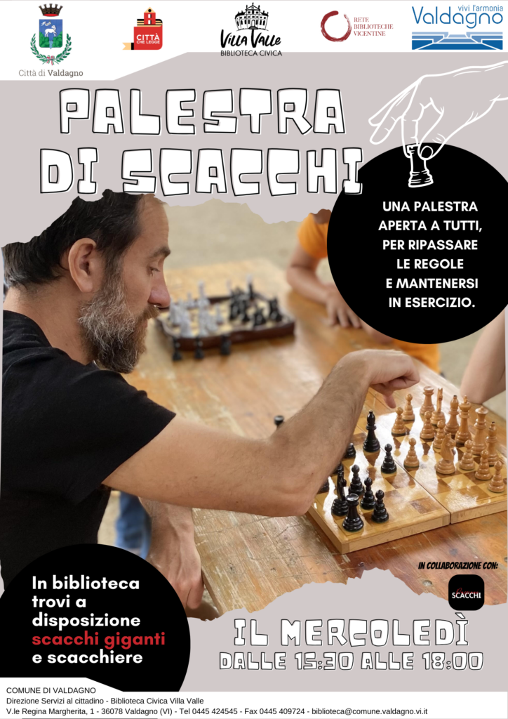 Il mercoledi troverai la Palestra di scacchi: qualcuno con cui giocare se lo sai già fare e qualcuno che può insegnarti le regole del gioco se ancora non le conosci