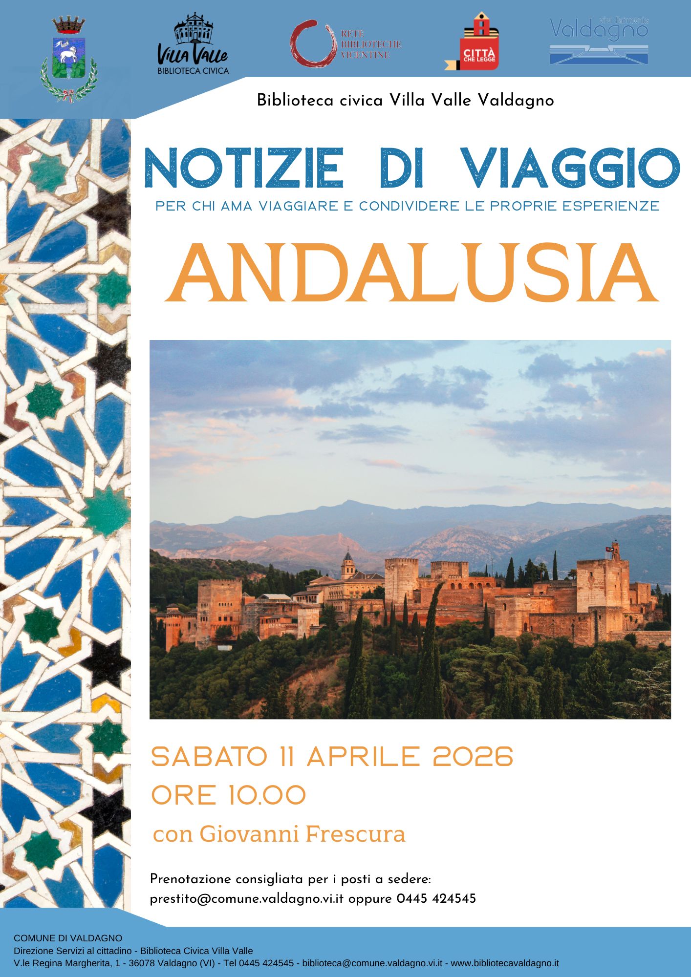 La prenotazione per i posti a sedere è sempre consigliata: prestito@comune.valdagno.vi.it oppure 0445 424545